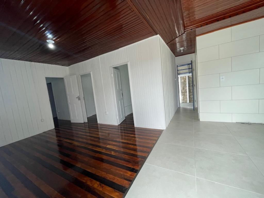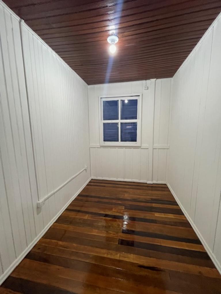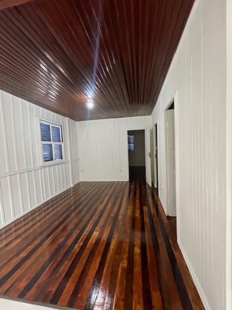 Toda a casa conta com piso de madeira envernizado com sinteco, conferindo charme e aconchego aos ambientes. As janelas com venezianas garantem boa ventilação e iluminação natural.